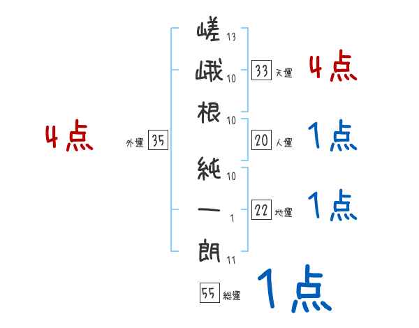 総運![]() | 嵯峨根純一朗さんの総運は55画の1つ星!欲張りな性格で軽率な行動に注意しましょう。病気に気をつけて。 あなたの人生を表す1番重要な運勢です。生涯を通じて影響する総合運となり、主に50歳以降の晩年期に影響を及ぼします。 |