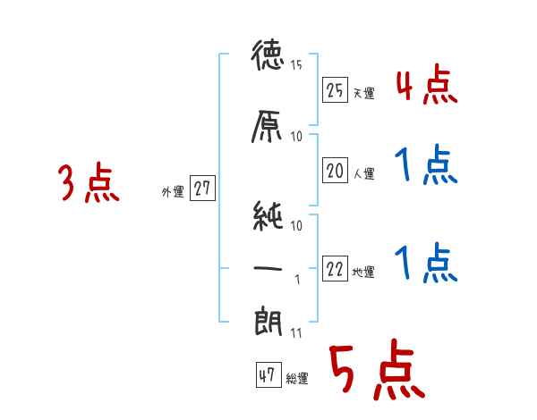 天運![]() | 徳原純一朗さんの天運は25画の4つ星!個性があり才能があふれる。強運の持ち主で発展する。 家系が持つ宿命的な運勢を表します。祖先から受け継いだ苗字ですので自分の力が及びません。家柄を象徴します。 |