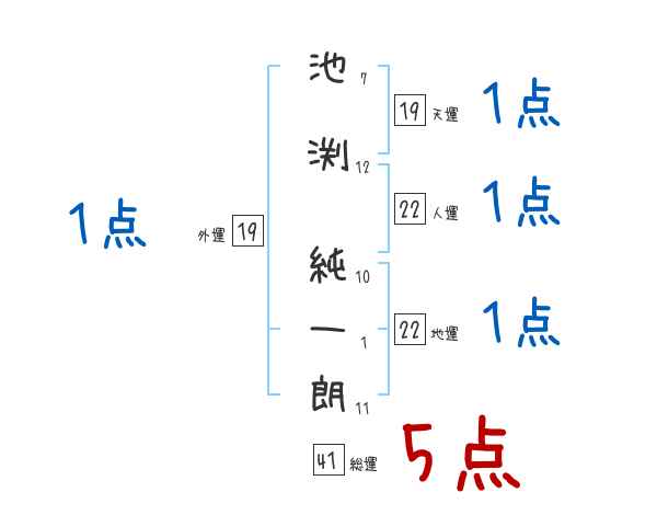外運![]() | 池渕純一朗さんの外運は19画の1つ星!優れた才能を持ちますが、協調性が足りないことも。周りの人と協力する事を意識しましょう。 生活面を象徴する運勢です。外部から受ける影響力を表し、結婚運、家庭運や職場、環境への順応性を表します。 |