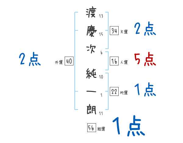 人運![]() | 渡慶次純一朗さんの人運は16画の5つ星!人望が厚く大きく発展する。逆転成功が見える。 性格や才能などを表す2番目に重要な運勢です。人間関係や協調性、社会的な成功に影響します。主に20歳から50歳ぐらいまでの中年期の運勢を表します。 |