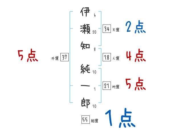 外運![]() | 伊瀬知純一郎さんの外運は37画の5つ星!努力家で順応性に優れる。現実的な考え方ができ忠実に物事をこなす。 生活面を象徴する運勢です。外部から受ける影響力を表し、結婚運、家庭運や職場、環境への順応性を表します。 |