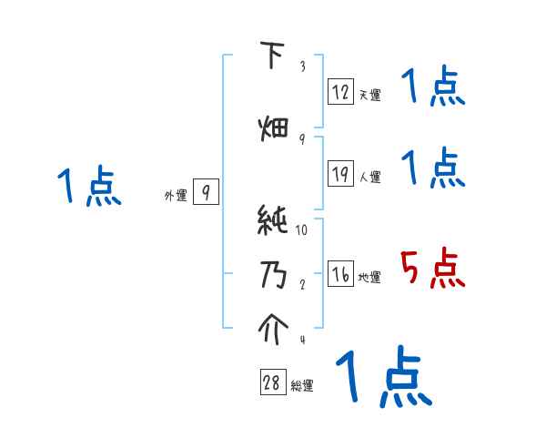 外運![]() | 下畑純乃介さんの外運は9画の1つ星!消極的で才能を発揮することが苦手なことも。周りの意見に耳を傾けましょう。 生活面を象徴する運勢です。外部から受ける影響力を表し、結婚運、家庭運や職場、環境への順応性を表します。 |