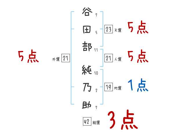 天運![]() | 谷田部純乃助さんの天運は23画の5つ星!想像力に優れ活力がある。一代で成功し名誉を手に入れる。 家系が持つ宿命的な運勢を表します。祖先から受け継いだ苗字ですので自分の力が及びません。家柄を象徴します。 |