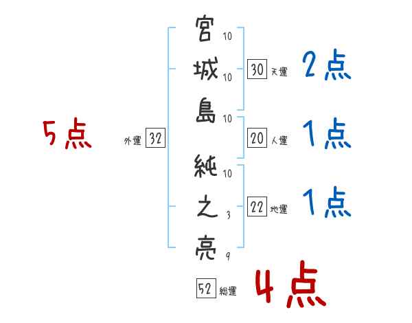 外運![]() | 宮城島純之亮さんの外運は32画の5つ星!柔軟性があり成功する。チャンスが多く金運が良い。 生活面を象徴する運勢です。外部から受ける影響力を表し、結婚運、家庭運や職場、環境への順応性を表します。 |