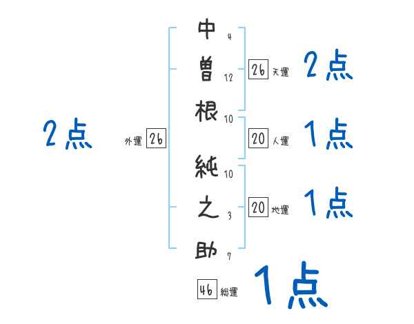 外運![]() | 中曽根純之助さんの外運は26画の2つ星!波瀾万丈かも。信頼できる人を大事にしましょう。 生活面を象徴する運勢です。外部から受ける影響力を表し、結婚運、家庭運や職場、環境への順応性を表します。 |