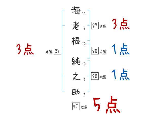 天運![]() | 海老根純之助さんの天運は27画の3つ星!頭脳明晰だが強情で摩擦が多い傾向。孤立に注意。 家系が持つ宿命的な運勢を表します。祖先から受け継いだ苗字ですので自分の力が及びません。家柄を象徴します。 |