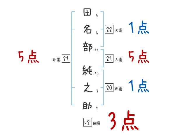 外運![]() | 田名部純之助さんの外運は21画の5つ星!統率力がある。独立し成功する。名誉を手に入れる。 生活面を象徴する運勢です。外部から受ける影響力を表し、結婚運、家庭運や職場、環境への順応性を表します。 |