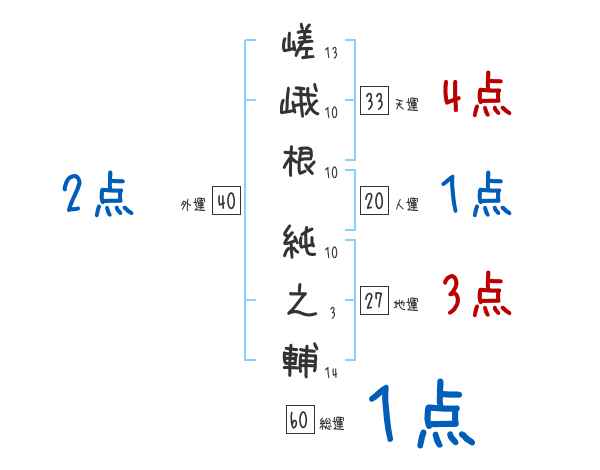 総運![]() | 嵯峨根純之輔さんの総運は60画の1つ星!悲観的で迷いやすい。波乱が多く損をしないように。 あなたの人生を表す1番重要な運勢です。生涯を通じて影響する総合運となり、主に50歳以降の晩年期に影響を及ぼします。 |