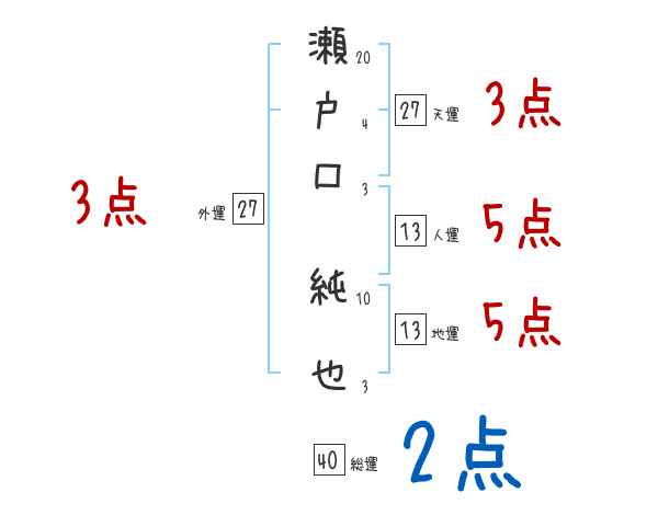 総運![]() | 瀬戸口純也さんの総運は40画の2つ星!自信過剰で物事に固執するためトラブルに注意。 あなたの人生を表す1番重要な運勢です。生涯を通じて影響する総合運となり、主に50歳以降の晩年期に影響を及ぼします。 |