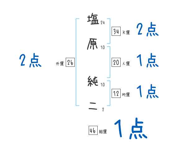 総運![]() | 塩原純二さんの総運は46画の1つ星!迷走することが多く苦労するかも。目先のことにとらわれないように。 あなたの人生を表す1番重要な運勢です。生涯を通じて影響する総合運となり、主に50歳以降の晩年期に影響を及ぼします。 |