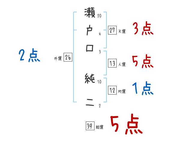 総運![]() | 瀬戸口純二さんの総運は39画の5つ星!社交性に優れ人望が厚い。人の上に立ち成功する。 あなたの人生を表す1番重要な運勢です。生涯を通じて影響する総合運となり、主に50歳以降の晩年期に影響を及ぼします。 |
