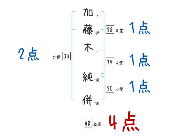 外運![]() | 加藤木純併さんの外運は34画の2つ星!独創性に優れるが、自尊心が強く災難に注意しましょう。 生活面を象徴する運勢です。外部から受ける影響力を表し、結婚運、家庭運や職場、環境への順応性を表します。 |
