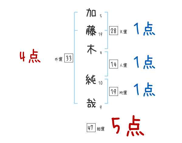 総運![]() | 加藤木純哉さんの総運は47画の5つ星!実力が開花し発展する円満な人生。財に恵まれる。 あなたの人生を表す1番重要な運勢です。生涯を通じて影響する総合運となり、主に50歳以降の晩年期に影響を及ぼします。 |