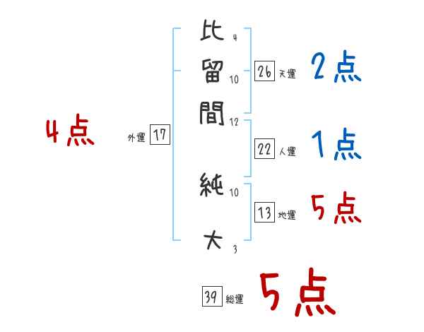 総運![]() | 比留間純大さんの総運は39画の5つ星!社交性に優れ人望が厚い。人の上に立ち成功する。 あなたの人生を表す1番重要な運勢です。生涯を通じて影響する総合運となり、主に50歳以降の晩年期に影響を及ぼします。 |