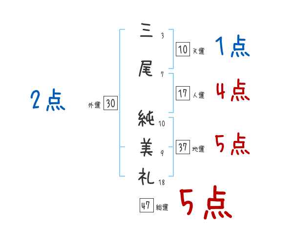 総運![]() | 三尾純美礼さんの総運は47画の5つ星!実力が開花し発展する円満な人生。財に恵まれる。 あなたの人生を表す1番重要な運勢です。生涯を通じて影響する総合運となり、主に50歳以降の晩年期に影響を及ぼします。 |