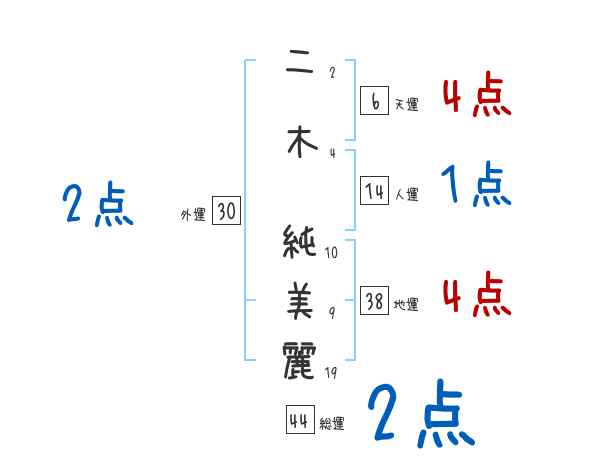 総運![]() | 二木純美麗さんの総運は44画の2つ星!誠実で慎重な性格。物事を考えすぎないように注意しましょう。 あなたの人生を表す1番重要な運勢です。生涯を通じて影響する総合運となり、主に50歳以降の晩年期に影響を及ぼします。 |