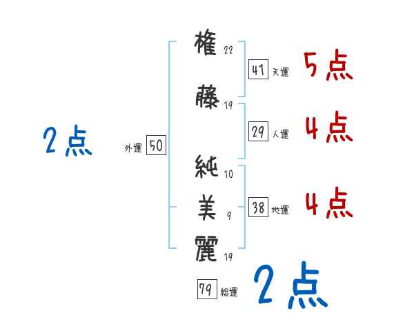 天運![]() | 権藤純美麗さんの天運は41画の5つ星!大志を抱き、目標に向かって実力を発揮し達成する。温和な性格。 家系が持つ宿命的な運勢を表します。祖先から受け継いだ苗字ですので自分の力が及びません。家柄を象徴します。 |