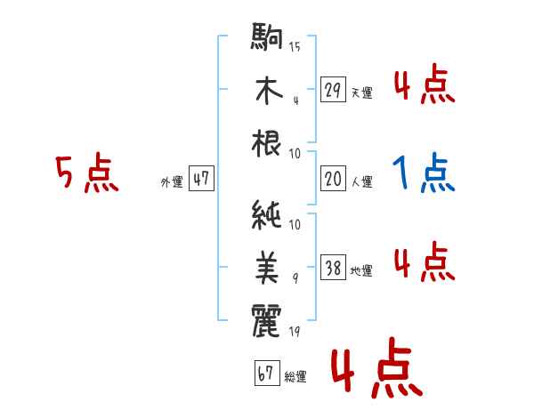 外運![]() | 駒木根純美麗さんの外運は47画の5つ星!実力が開花し発展する円満な人生。財に恵まれる。 生活面を象徴する運勢です。外部から受ける影響力を表し、結婚運、家庭運や職場、環境への順応性を表します。 |