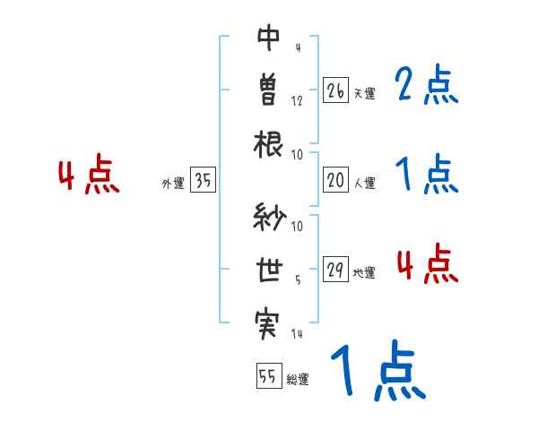 外運![]() | 中曽根紗世実さんの外運は35画の4つ星!温厚な性格で感受性が高い。穏和な性格で人望が厚い。 生活面を象徴する運勢です。外部から受ける影響力を表し、結婚運、家庭運や職場、環境への順応性を表します。 |