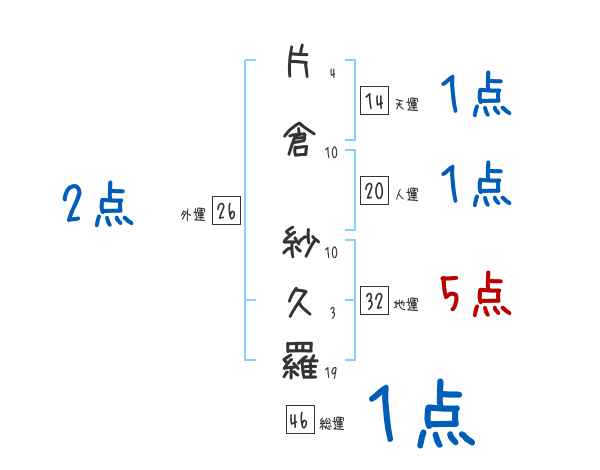 外運![]() | 片倉紗久羅さんの外運は26画の2つ星!波瀾万丈かも。信頼できる人を大事にしましょう。 生活面を象徴する運勢です。外部から受ける影響力を表し、結婚運、家庭運や職場、環境への順応性を表します。 |