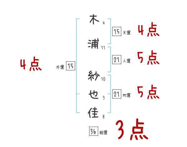 総運![]() | 木浦紗也佳さんの総運は36画の3つ星!先見性が豊かです。多少神経質で苦労することも。 あなたの人生を表す1番重要な運勢です。生涯を通じて影響する総合運となり、主に50歳以降の晩年期に影響を及ぼします。 |