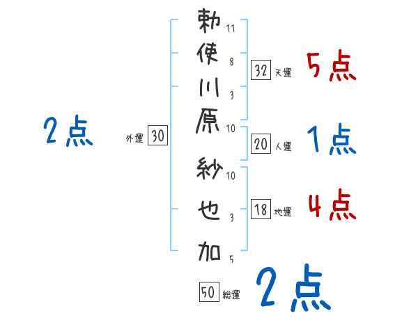 天運![]() | 勅使川原紗也加さんの天運は32画の5つ星!柔軟性があり成功する。チャンスが多く金運が良い。 家系が持つ宿命的な運勢を表します。祖先から受け継いだ苗字ですので自分の力が及びません。家柄を象徴します。 |