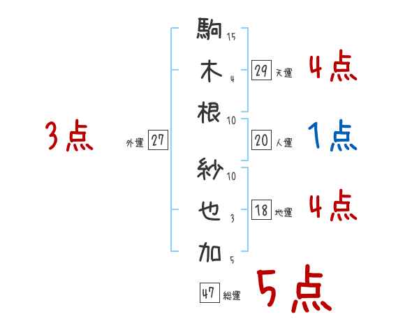 外運![]() | 駒木根紗也加さんの外運は27画の3つ星!頭脳明晰だが強情で摩擦が多い傾向。孤立に注意。 生活面を象徴する運勢です。外部から受ける影響力を表し、結婚運、家庭運や職場、環境への順応性を表します。 |