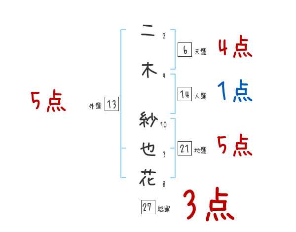 総運![]() | 二木紗也花さんの総運は27画の3つ星!頭脳明晰だが強情で摩擦が多い傾向。孤立に注意。 あなたの人生を表す1番重要な運勢です。生涯を通じて影響する総合運となり、主に50歳以降の晩年期に影響を及ぼします。 |