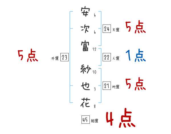 天運![]() | 安次富紗也花さんの天運は24画の5つ星!家庭運が良く順調な人生。金運にも恵まれる。 家系が持つ宿命的な運勢を表します。祖先から受け継いだ苗字ですので自分の力が及びません。家柄を象徴します。 |