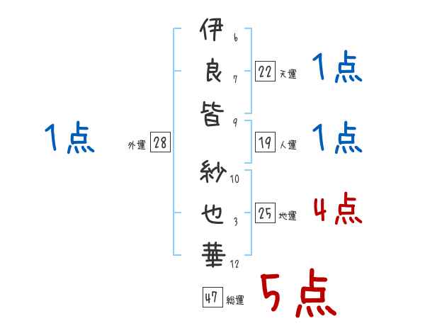 総運![]() | 伊良皆紗也華さんの総運は47画の5つ星!実力が開花し発展する円満な人生。財に恵まれる。 あなたの人生を表す1番重要な運勢です。生涯を通じて影響する総合運となり、主に50歳以降の晩年期に影響を及ぼします。 |