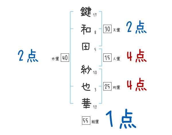 天運![]() | 鍵和田紗也華さんの天運は30画の2つ星!浮き沈みの激しさに注意しましょう。 家系が持つ宿命的な運勢を表します。祖先から受け継いだ苗字ですので自分の力が及びません。家柄を象徴します。 |