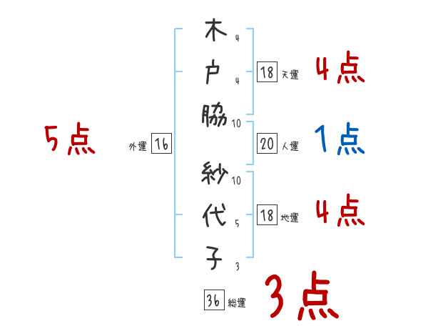 外運![]() | 木戸脇紗代子さんの外運は16画の5つ星!人望が厚く大きく発展する。逆転成功が見える。 生活面を象徴する運勢です。外部から受ける影響力を表し、結婚運、家庭運や職場、環境への順応性を表します。 |