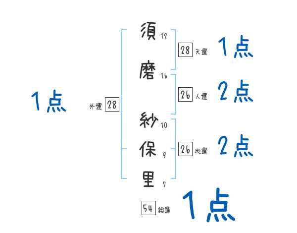 総運![]() | 須磨紗保里さんの総運は54画の1つ星!トラブルが多いかも。周りをよく見て協調して過ごしましょう。 あなたの人生を表す1番重要な運勢です。生涯を通じて影響する総合運となり、主に50歳以降の晩年期に影響を及ぼします。 |