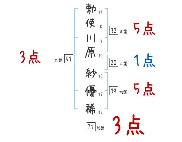 外運![]() | 勅使川原紗優稀さんの外運は51画の3つ星!変化が激しく、危険に注意。堅実な性格。 生活面を象徴する運勢です。外部から受ける影響力を表し、結婚運、家庭運や職場、環境への順応性を表します。 |