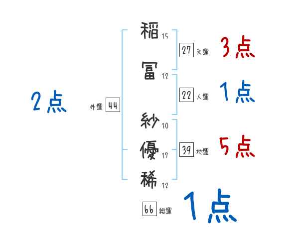 総運![]() | 稲冨紗優稀さんの総運は66画の1つ星!迷うことが多く挫折しやすい傾向が。辛抱強く物事に取り組みましょう。 あなたの人生を表す1番重要な運勢です。生涯を通じて影響する総合運となり、主に50歳以降の晩年期に影響を及ぼします。 |