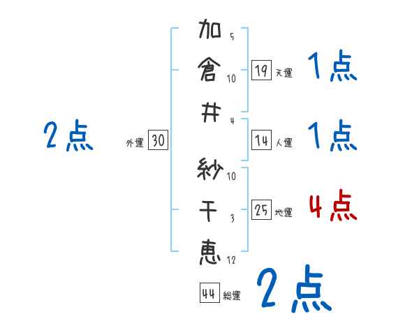 総運![]() | 加倉井紗千恵さんの総運は44画の2つ星!誠実で慎重な性格。物事を考えすぎないように注意しましょう。 あなたの人生を表す1番重要な運勢です。生涯を通じて影響する総合運となり、主に50歳以降の晩年期に影響を及ぼします。 |