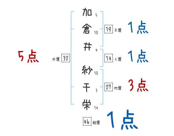 外運![]() | 加倉井紗千栄さんの外運は32画の5つ星!柔軟性があり成功する。チャンスが多く金運が良い。 生活面を象徴する運勢です。外部から受ける影響力を表し、結婚運、家庭運や職場、環境への順応性を表します。 |
