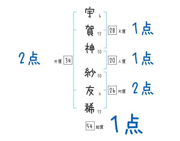 外運![]() | 宇賀神紗友稀さんの外運は34画の2つ星!独創性に優れるが、自尊心が強く災難に注意しましょう。 生活面を象徴する運勢です。外部から受ける影響力を表し、結婚運、家庭運や職場、環境への順応性を表します。 |