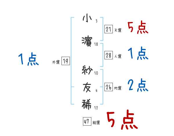 天運![]() | 小濵紗友稀さんの天運は21画の5つ星!統率力がある。独立し成功する。名誉を手に入れる。 家系が持つ宿命的な運勢を表します。祖先から受け継いだ苗字ですので自分の力が及びません。家柄を象徴します。 |