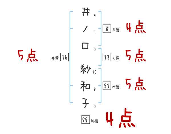 天運![]() | 井ノ口紗和子さんの天運は8画の4つ星!勤勉家。根気強く努力し成功する。忍耐力がある。 家系が持つ宿命的な運勢を表します。祖先から受け継いだ苗字ですので自分の力が及びません。家柄を象徴します。 |