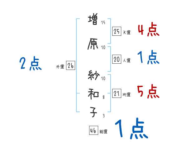 外運![]() | 増原紗和子さんの外運は26画の2つ星!波瀾万丈かも。信頼できる人を大事にしましょう。 生活面を象徴する運勢です。外部から受ける影響力を表し、結婚運、家庭運や職場、環境への順応性を表します。 |