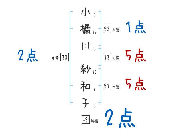 総運![]() | 小橋川紗和子さんの総運は43画の2つ星!頑固な性格で独立心が強いかも。やや非現実的で浪費に注意しましょう。 あなたの人生を表す1番重要な運勢です。生涯を通じて影響する総合運となり、主に50歳以降の晩年期に影響を及ぼします。 |