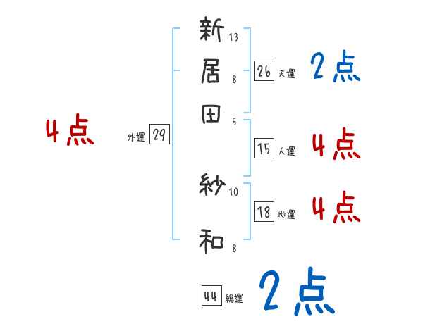 総運![]() | 新居田紗和さんの総運は44画の2つ星!誠実で慎重な性格。物事を考えすぎないように注意しましょう。 あなたの人生を表す1番重要な運勢です。生涯を通じて影響する総合運となり、主に50歳以降の晩年期に影響を及ぼします。 |