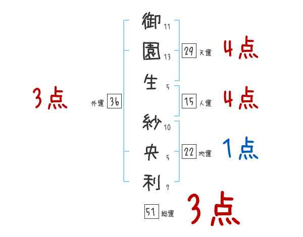 総運![]() | 御園生紗央利さんの総運は51画の3つ星!変化が激しく、危険に注意。堅実な性格。 あなたの人生を表す1番重要な運勢です。生涯を通じて影響する総合運となり、主に50歳以降の晩年期に影響を及ぼします。 |