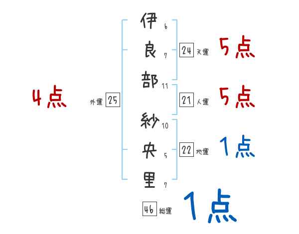 天運![]() | 伊良部紗央里さんの天運は24画の5つ星!家庭運が良く順調な人生。金運にも恵まれる。 家系が持つ宿命的な運勢を表します。祖先から受け継いだ苗字ですので自分の力が及びません。家柄を象徴します。 |