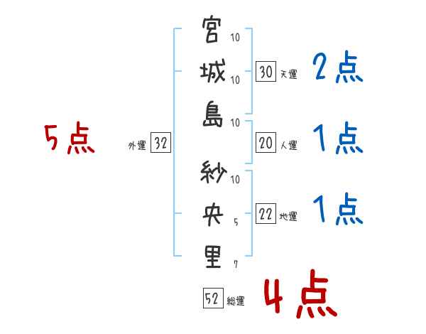 外運![]() | 宮城島紗央里さんの外運は32画の5つ星!柔軟性があり成功する。チャンスが多く金運が良い。 生活面を象徴する運勢です。外部から受ける影響力を表し、結婚運、家庭運や職場、環境への順応性を表します。 |