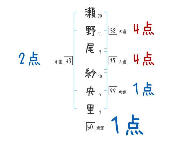 総運![]() | 瀬野尾紗央里さんの総運は60画の1つ星!悲観的で迷いやすい。波乱が多く損をしないように。 あなたの人生を表す1番重要な運勢です。生涯を通じて影響する総合運となり、主に50歳以降の晩年期に影響を及ぼします。 |