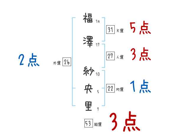 総運![]() | 福澤紗央里さんの総運は53画の3つ星!やや見栄っ張りで虚栄心がある。散財に注意。 あなたの人生を表す1番重要な運勢です。生涯を通じて影響する総合運となり、主に50歳以降の晩年期に影響を及ぼします。 |
