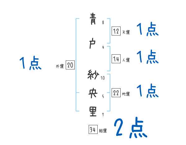 総運![]() | 青戸紗央里さんの総運は34画の2つ星!独創性に優れるが、自尊心が強く災難に注意しましょう。 あなたの人生を表す1番重要な運勢です。生涯を通じて影響する総合運となり、主に50歳以降の晩年期に影響を及ぼします。 |