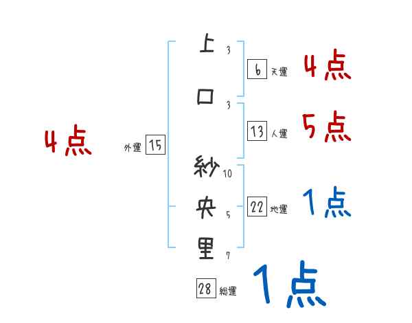 総運![]() | 上口紗央里さんの総運は28画の1つ星!家庭環境に注意。スポーツで活躍できる能力があるかも。 あなたの人生を表す1番重要な運勢です。生涯を通じて影響する総合運となり、主に50歳以降の晩年期に影響を及ぼします。 |